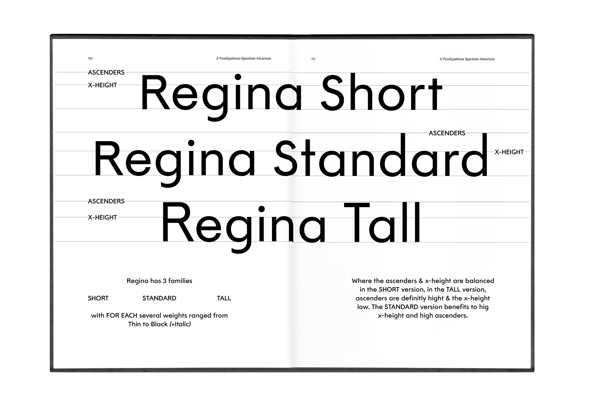 Regina offers three families: the Short one with balanced x-height and Ascenders height. The Standard with an high x-height and high Ascenders. And the Tall for Futura lovers with a low x-height and high ascenders & uppercases.