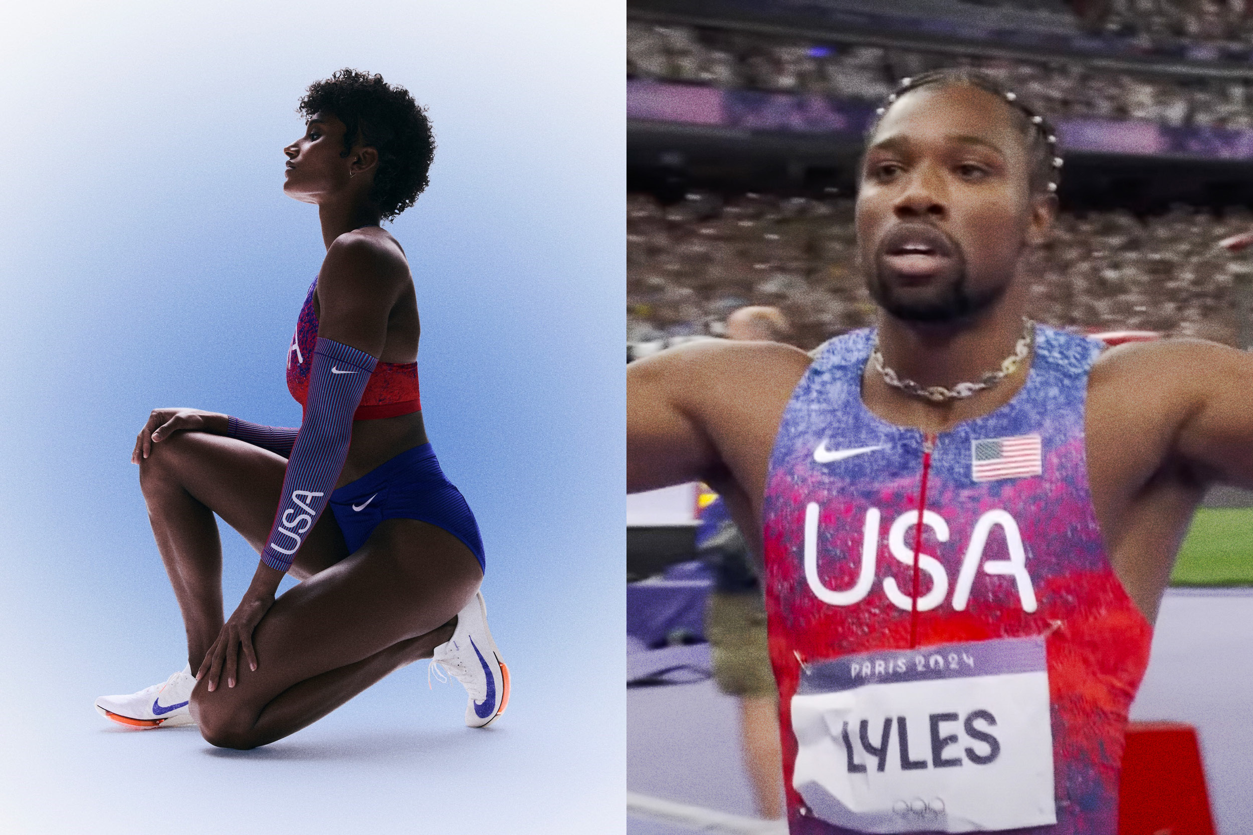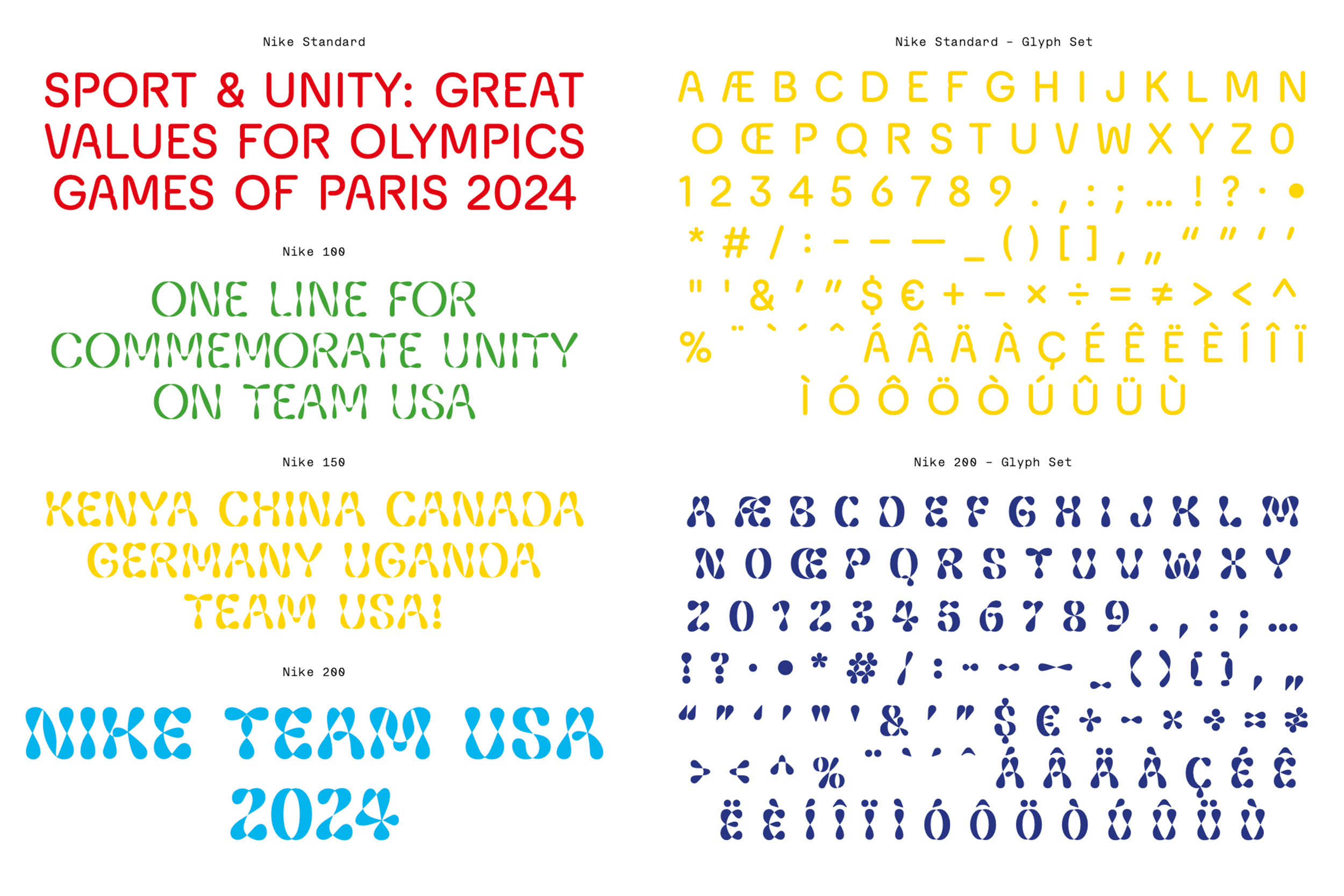 Custom typeface for Nike. A variable font for the Olympics Games of Paris 2024. The typeface has a dual personality: highly legible for athlete jerseys yet full of character for merchandising. Futura, iconic for the brand, inspired its round letters, subtly echoing the Olympic rings. Designing a font that suggests movement while remaining versatile was a challenge. The lines trace an athlete’s trajectory, like a long-exposure photograph. This visual language conveys motion and connection, reminiscent of the Olympic rings. The variable font, enabling smooth transitions between styles. Letter ends twist and curves intersect, allowing modifications via a “movement” slider. The font defies categorisation: neither masculine nor feminine, neither bold nor delicate. It’s hard to pin down as performance-oriented or pleasure-focused, local or global. This versatility sets it apart from the bold, angled typefaces typical in sports branding.