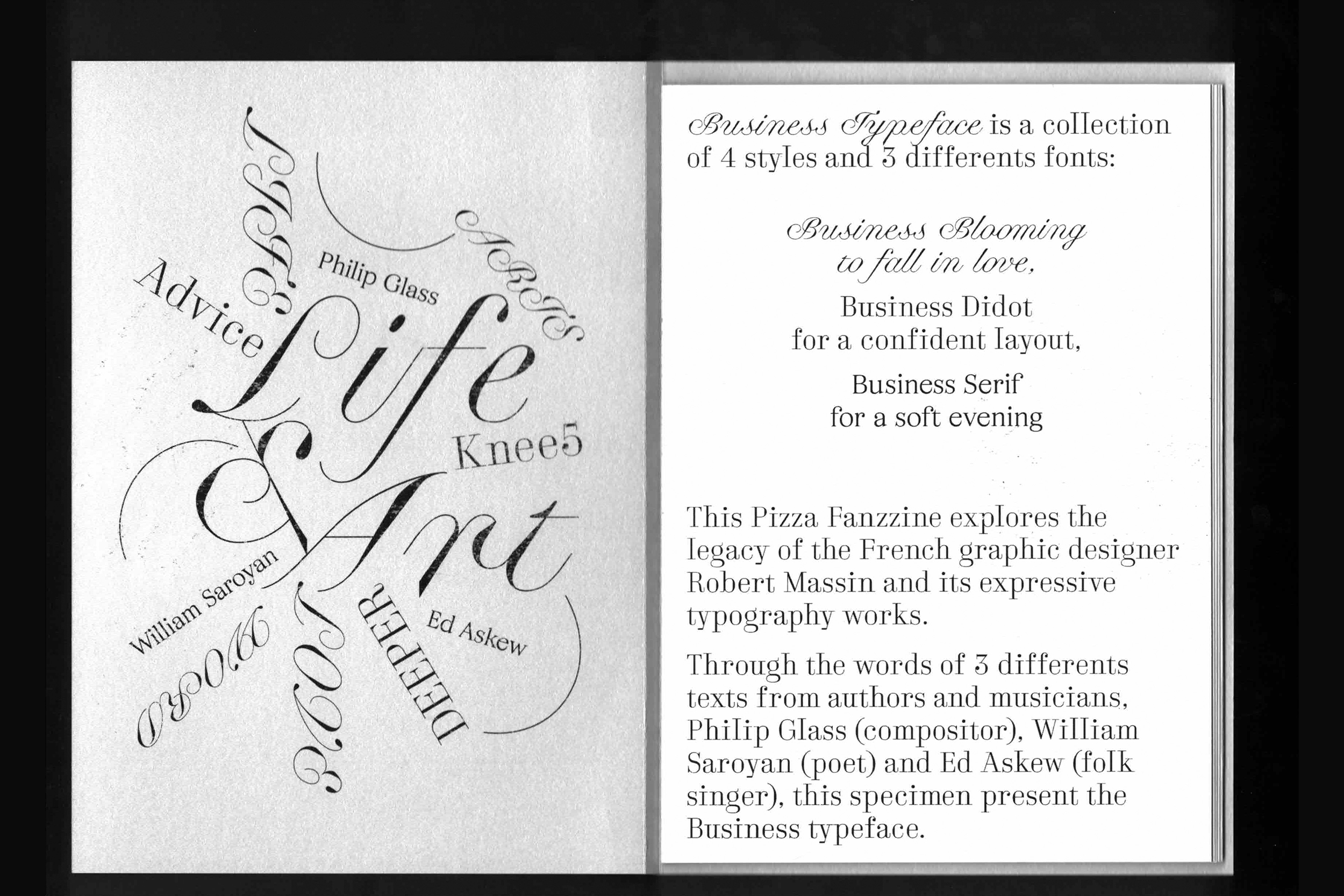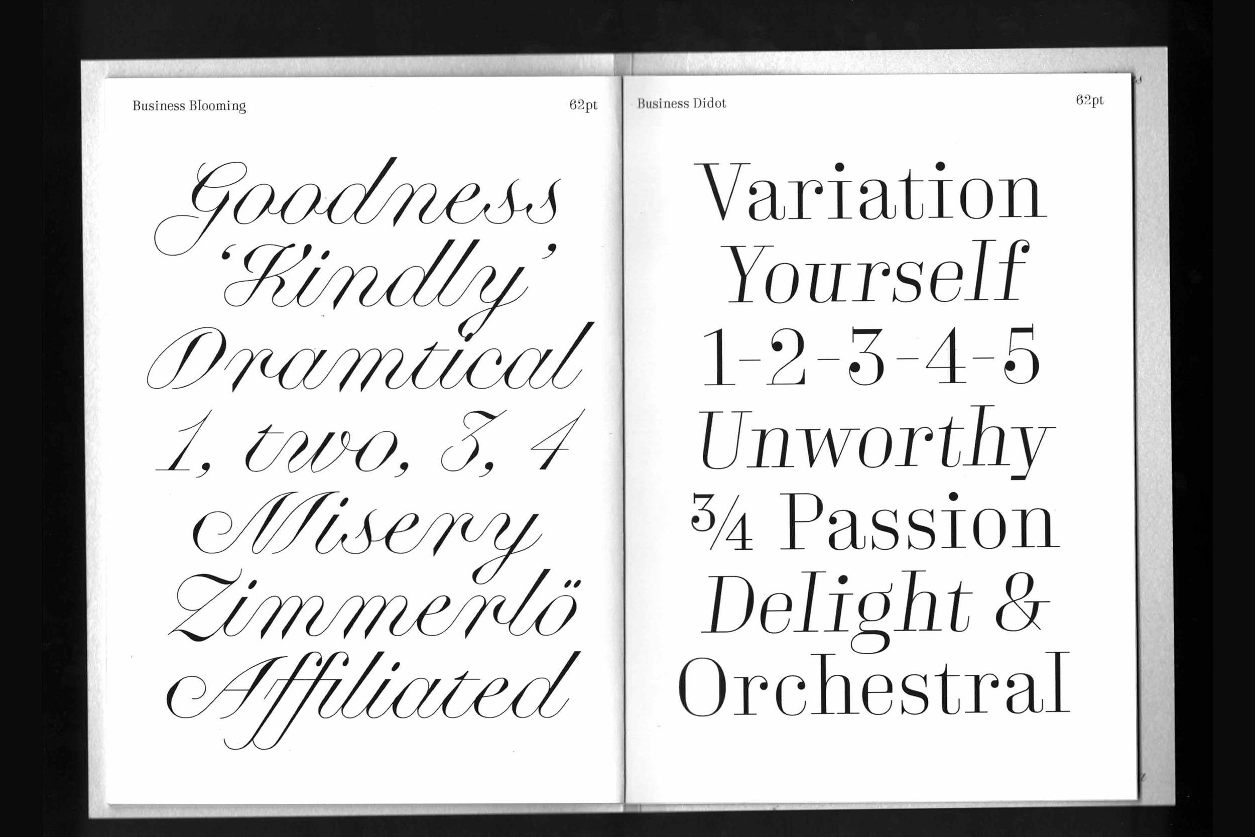 Business is a collection of three font-families including a blooming script, a condifent didot and a cosy serif. The Business Blooming contain a Optical Size variable to match the right contrast depending of the size. The Business DIdot and Business Serif have Display and Text versions.