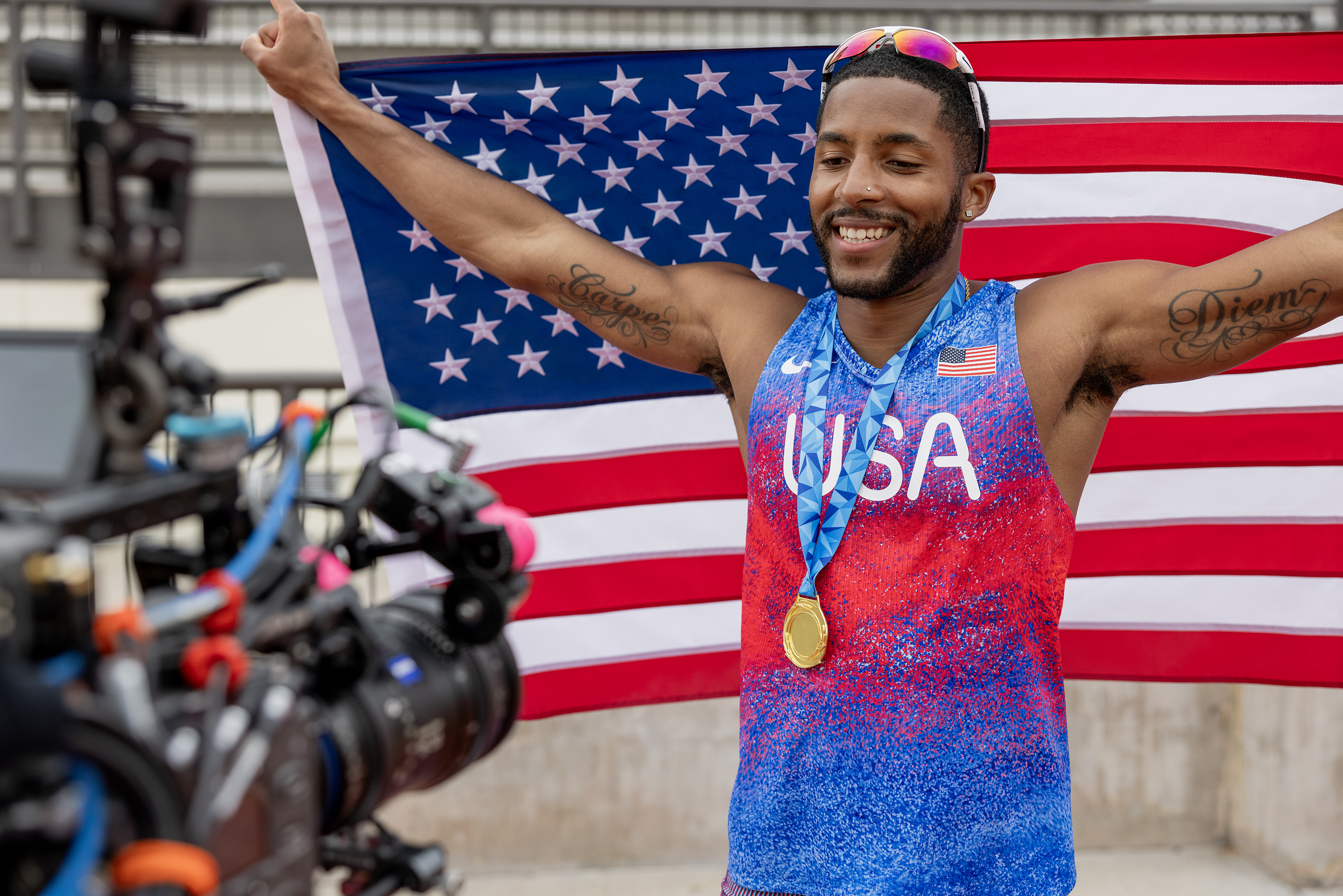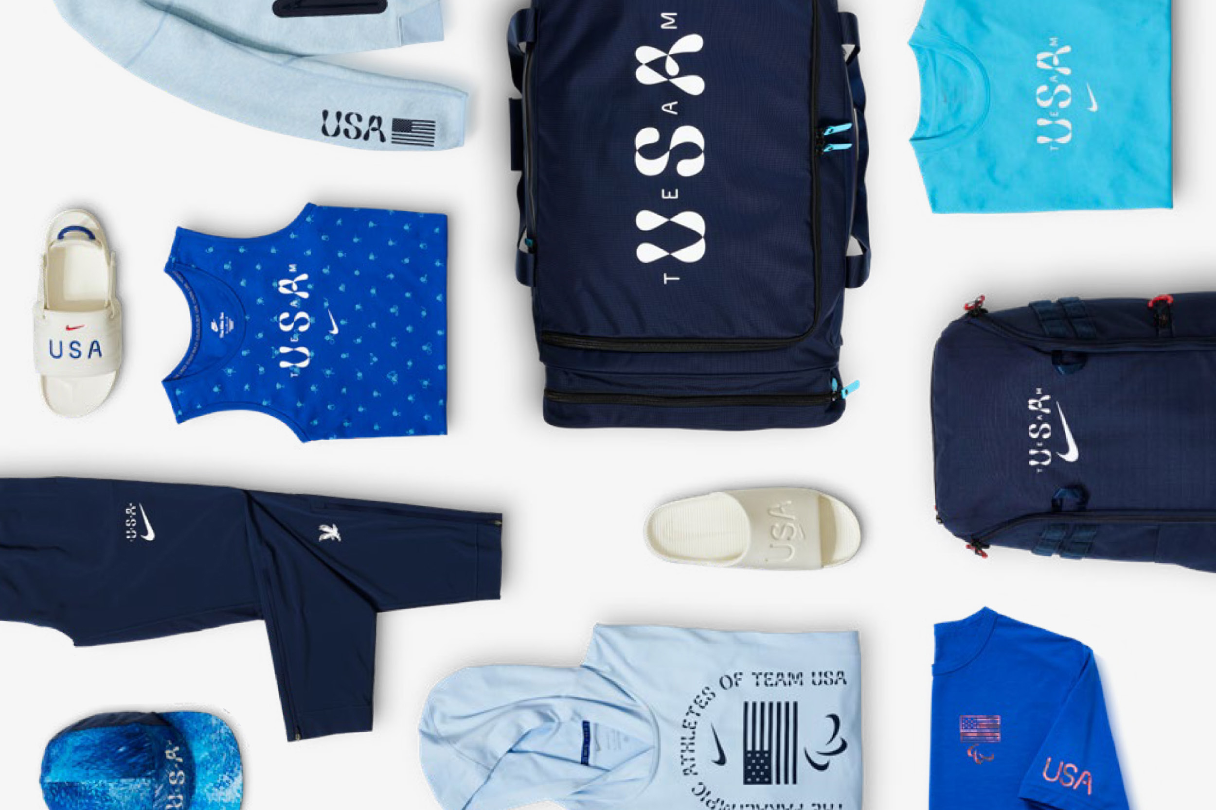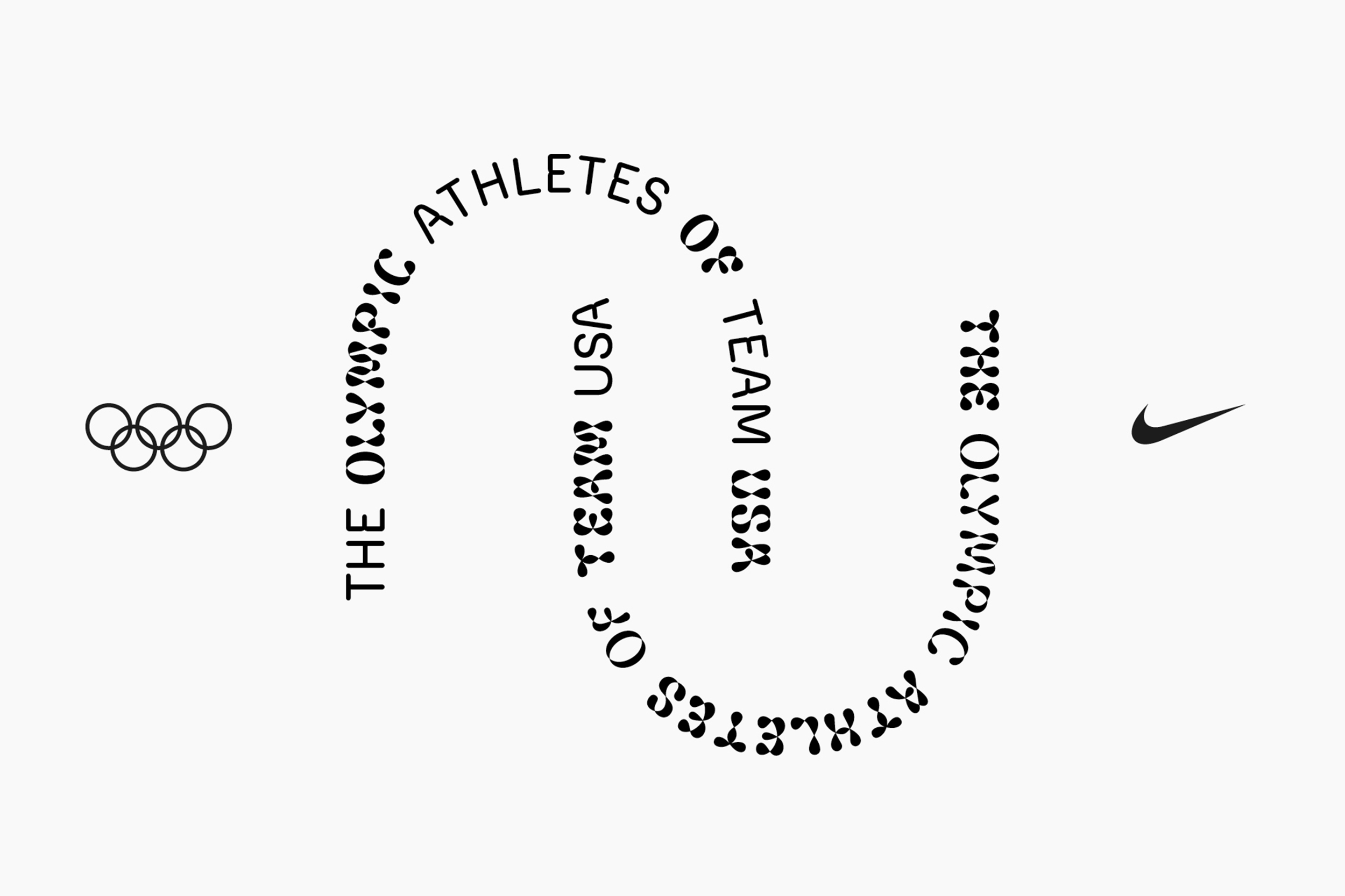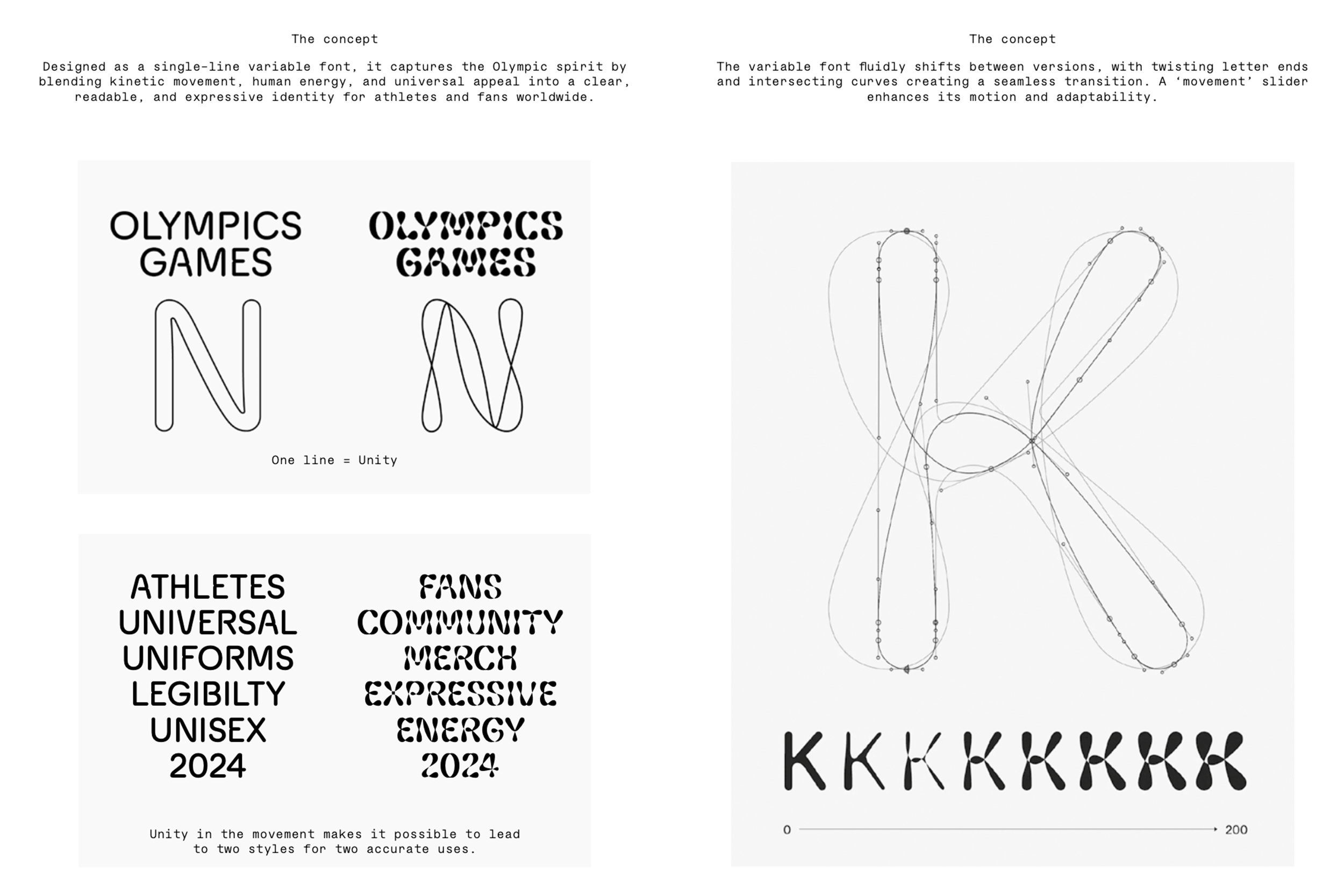 Custom typeface for Nike. A variable font for the Olympics Games of Paris 2024. The typeface has a dual personality: highly legible for athlete jerseys yet full of character for merchandising. Futura, iconic for the brand, inspired its round letters, subtly echoing the Olympic rings. Designing a font that suggests movement while remaining versatile was a challenge. The lines trace an athlete’s trajectory, like a long-exposure photograph. This visual language conveys motion and connection, reminiscent of the Olympic rings. The variable font, enabling smooth transitions between styles. Letter ends twist and curves intersect, allowing modifications via a “movement” slider. The font defies categorisation: neither masculine nor feminine, neither bold nor delicate. It’s hard to pin down as performance-oriented or pleasure-focused, local or global. This versatility sets it apart from the bold, angled typefaces typical in sports branding.